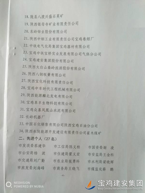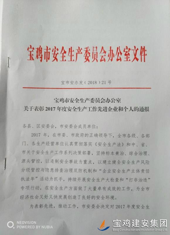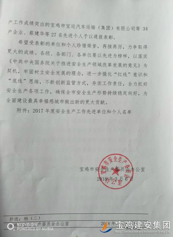 近期,寶雞市安委會對2017年度安全生產(chǎn)先進單位進行了通報,我單位在考核中以優(yōu)異的成績獲得了此項殊榮。當然,取得這樣的成績,離不開各級領(lǐng)導的正確決策和基層單位的艱辛付出,公司安委會在此表示感謝。 2017年,公司始終圍繞在國家的大政方針框架下,積極展開以《安全生產(chǎn)法》及相關(guān)規(guī)范標準為核心的安全工作,堅持標本兼治、綜合治理、源頭管控,以遏制安全事故為重點,建立健全安全生產(chǎn)風險分級管控與隱患排查治理雙重機制,持續(xù)開展安全生產(chǎn)專項檢查,杜絕了惡性事故的發(fā)生。在安全生產(chǎn)標準化建設(shè)中,公司始終以“科技創(chuàng)新、合理投入、擇善而從”為出發(fā)點進行部署管理,通過系統(tǒng)管理及一系列舉措,使公司安全管理走在本土行業(yè)前列,且在多次檢查驗收中,獲得省、市級領(lǐng)導的點贊。 九牛一毫莫自夸 驕傲自滿必翻車,成績只代表過去,2018年,我們要完善不足,戒驕戒躁,砥礪前行。 寶雞建安集團股份有限公司安委會 2018年4月25日