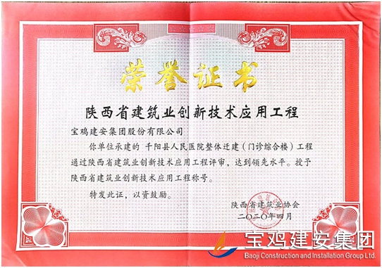 20204月,陜西省建筑業(yè)協(xié)會組織召開了2020年上半年陜西省建設(shè)新技術(shù)示范工程評審會議,由我公司承建的千陽縣人民醫(yī)院整體遷建(門診綜合樓)工程以優(yōu)異的成績通過評審,且推廣應(yīng)用新技術(shù)總體水平都達到省內(nèi)領(lǐng)先水平。