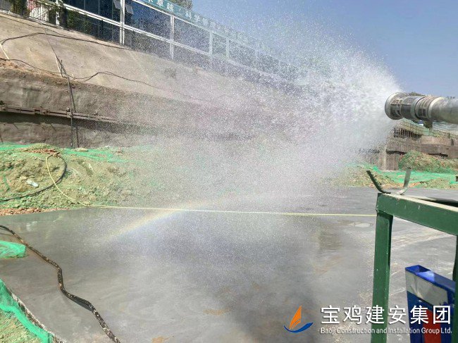 工程現(xiàn)場采用全封閉施工,主要道路混凝土硬化,周邊種植了抑塵效果明顯的花卉與綠植,施工現(xiàn)場采用移動(dòng)式灑水車,定人、定時(shí)進(jìn)行灑水降塵作業(yè),工地出入口安裝了全自動(dòng)三聯(lián)裝洗車臺(tái),保證車輛出入清潔。設(shè)置的移動(dòng)式降塵霧炮、噴淋系統(tǒng),有效限制了施工揚(yáng)塵,裸露場地和堆放粉塵材料的地方采取防塵網(wǎng)進(jìn)行 100%全面覆蓋,從源頭控制揚(yáng)塵污染。