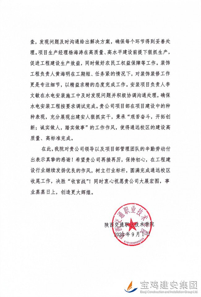 據(jù)悉,陜西交通職業(yè)技術(shù)學(xué)院新校區(qū)一期建設(shè)項(xiàng)目【EPC】一標(biāo)段建筑面積為48200.59平方米,工程造價(jià)3.4億。合同工期為2021年11月25日至2023年7月7日總工期600天,實(shí)際開工日期為2022年5月4日,經(jīng)過(guò)一年多的施工,現(xiàn)已完成教學(xué)樓和室外工程全部施工內(nèi)容,并于2023年9月1日正式投入使用。